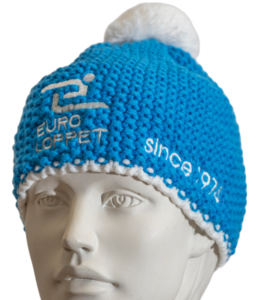 Modrá brmbolcová, štrikovaná čiapka zo série EUROLOPPET 1974